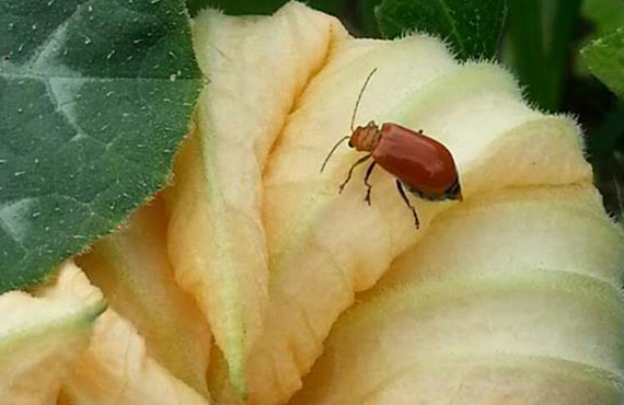 菜園裡最常見的常客,棲息於南瓜、苦瓜、瓠瓜等瓜類植物葉片上,成群的黃守瓜(又稱金花蟲)會將葉面咬得千瘡百孔,幼蟲以根部為食,成蟲啃食葉面,形成弧狀的食痕,陽光下常見在菜園的葉片、花朵上活動。